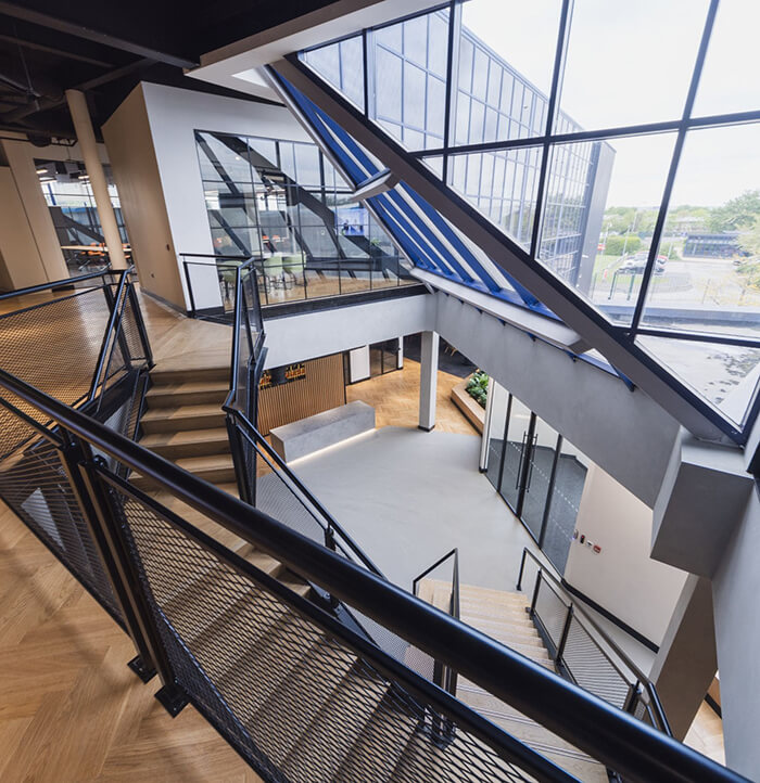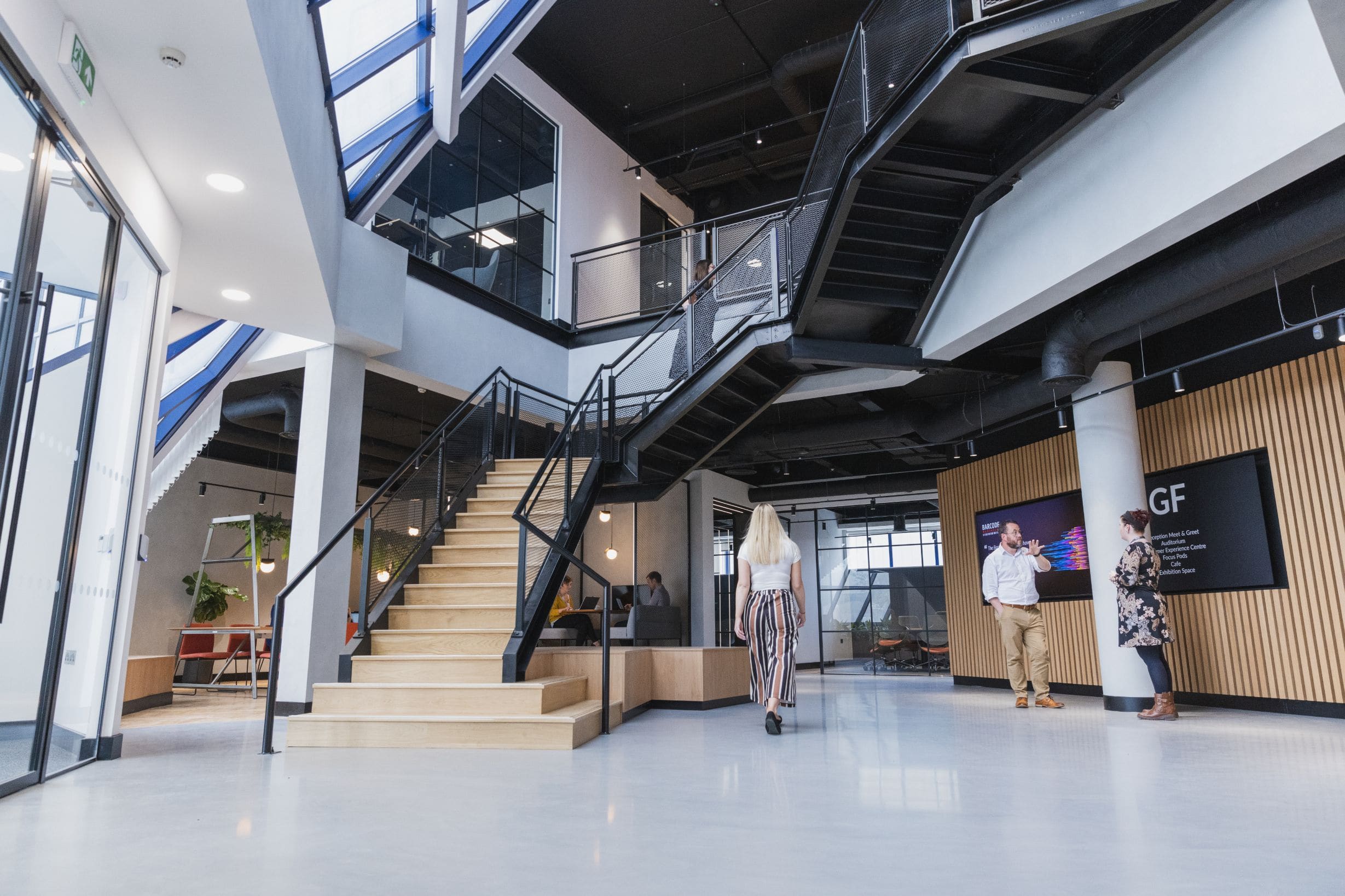 With a wide variety of settings, such as open and closed meeting rooms, collaboration areas, pods, open plan desking, informal meeting areas and quiet booths, as well as a ground floor café area and auditorium, the building provides people with a multitude of spaces to choose from.
