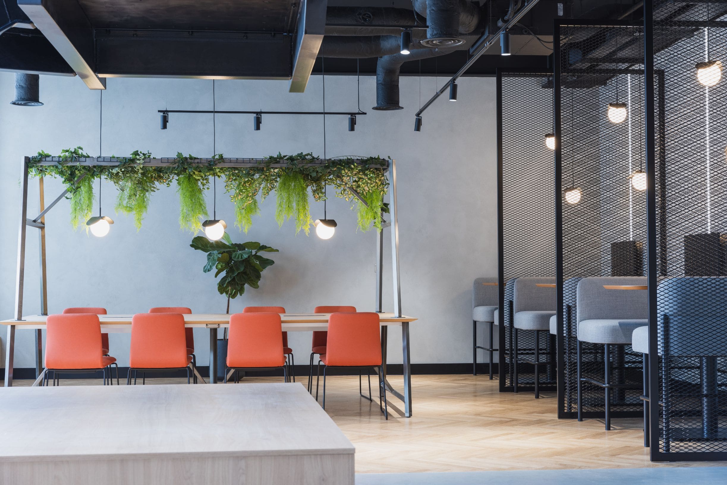 Kitted out with the latest business technology including interactive, state of the art demo spaces, the design incorporates dark materials to contrast against natural wood and a muted colour palette, giving a true sense of drama. Throughout the building, bright accents of colour appear in the form of booths and seating, coupled with a wide array of indoor plants, to help create a welcoming and refreshing environment. Glass joinery throughout utilises the natural light and provides that airy feel.
