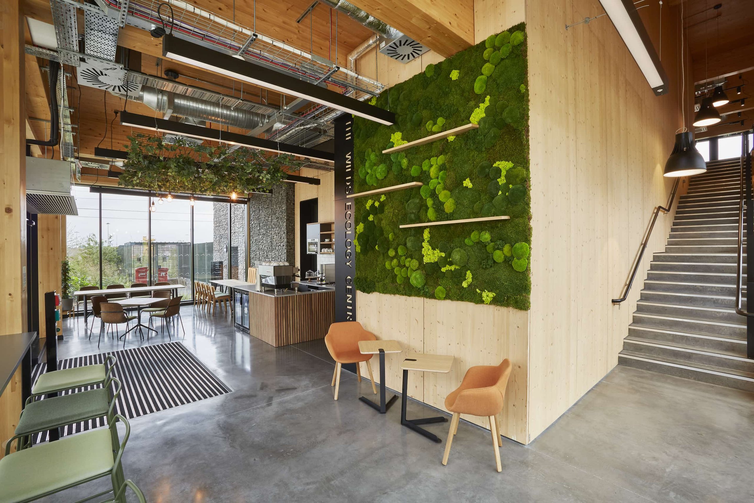 Our proposal included a café kiosk centrally located in the main entrance, featuring biophilia (to resonate with the ecology setting) and lots of flexible furniture pieces with recycled and sustainable materials. The once furniture-only brief then developed to include M&E, allowing the café to function, and AV works for projectors and speakers in the exhibition space.