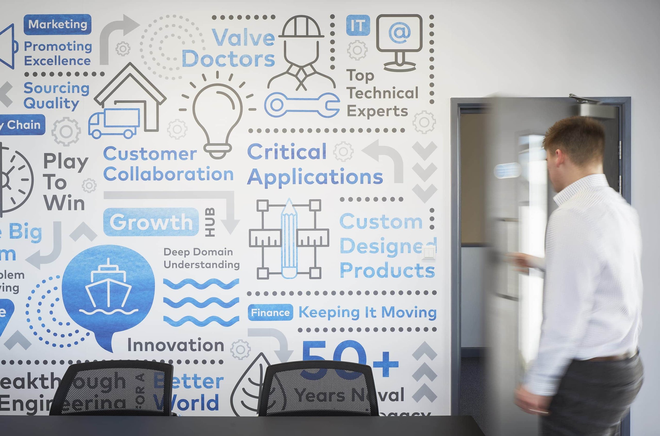 Our solution revolved around a collaborative and engaging space that could be used by warehouse and office teams alike. The fresh, bright colour palette is complemented by bold and vibrant wall graphics to engage people with the brand and culture of IMI.
