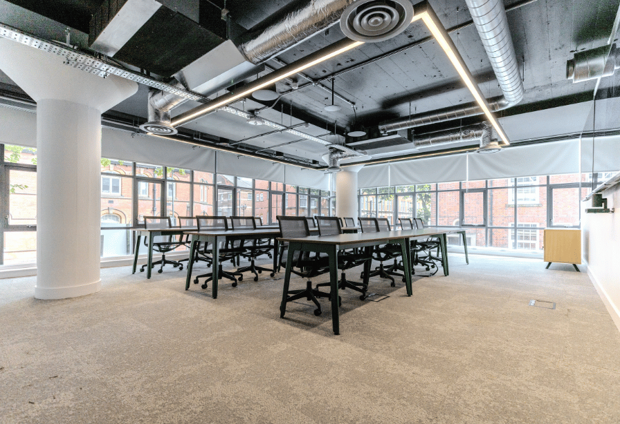The project began as a Cat A strip-out, removing all existing finishes, installing new MEP services, and raising the floor. We formed new toilet blocks and altered the reception area to accommodate a bespoke desk, all while respecting the building’s listed elements.